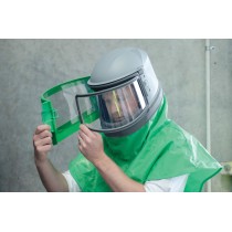 Casco de granallado para conexión a linea de aire respirable, con difusor que dirige el aire a la zona de respiración y evita que se empañe la lente, ocular de gran visión periférica e inferior, sello de visor contra el polvo y partículas, acolchado interno de confort y amortiguación de ruido.